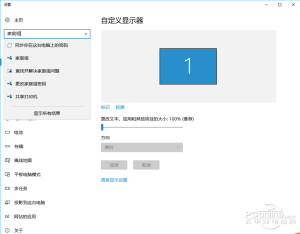 2、找到【家庭组】的方法和找【共享和网络中心】一样,就是在【显示设置】面板的搜索框中搜索家庭组,找到并点击进去。
